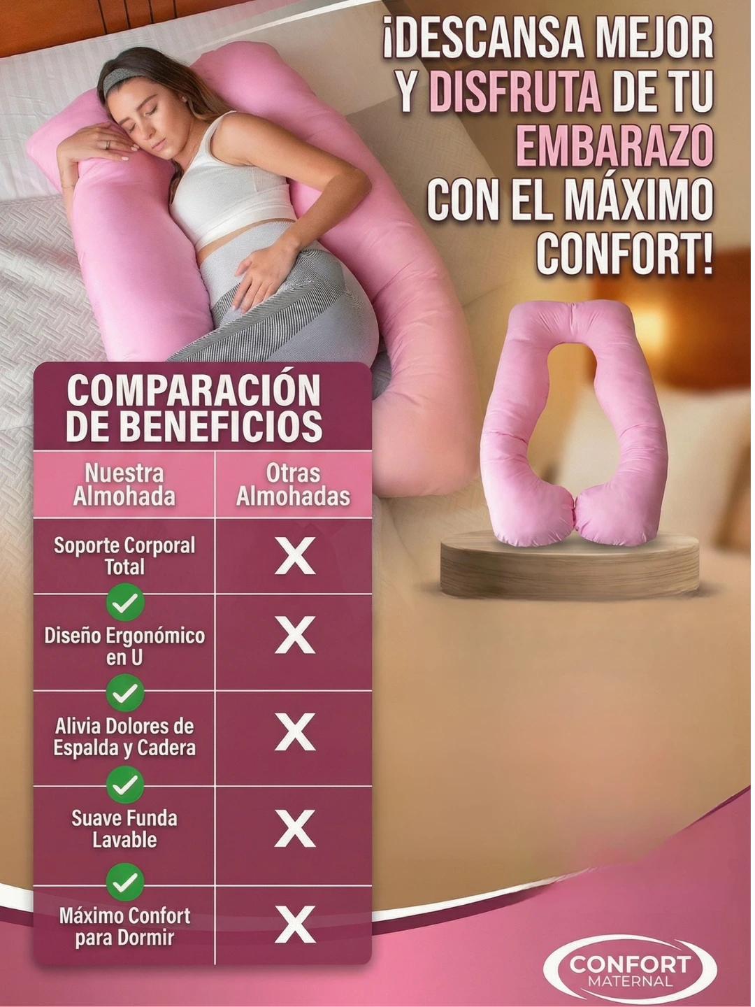 Está pensada para mejorar la sensación de comodidad y soporte al dormir, ayudando a mantener una postura más estable y relajada durante el descanso.