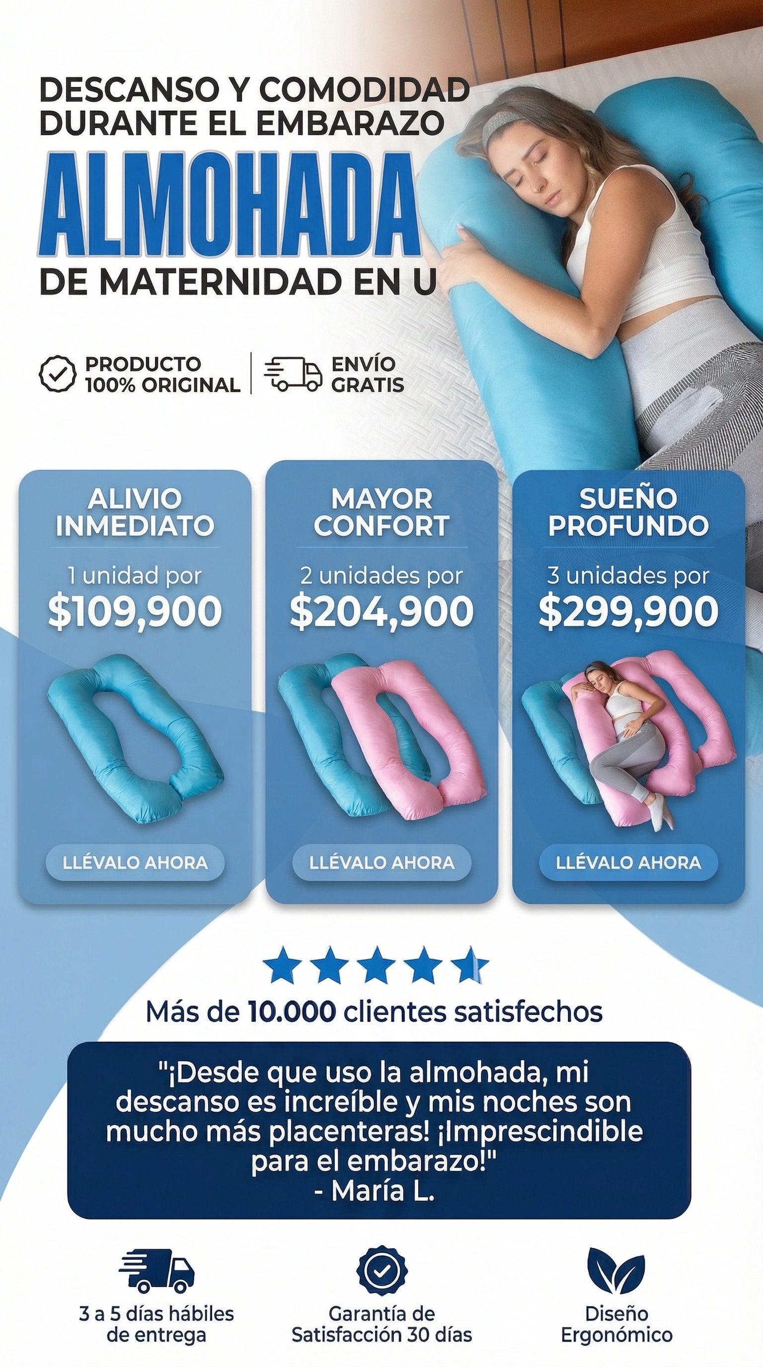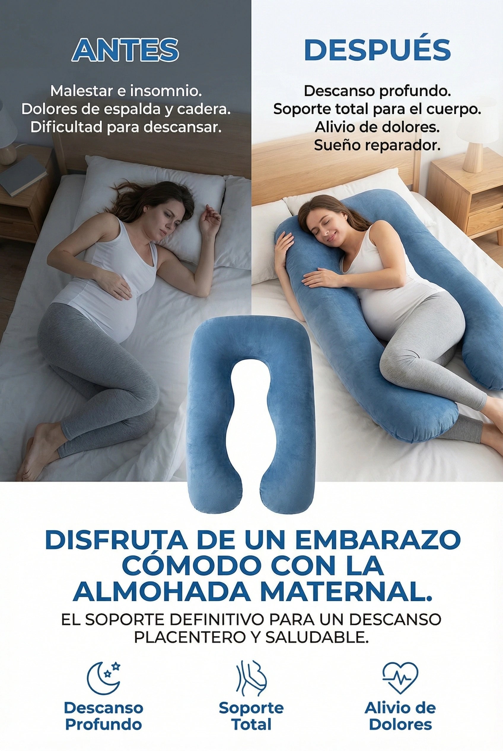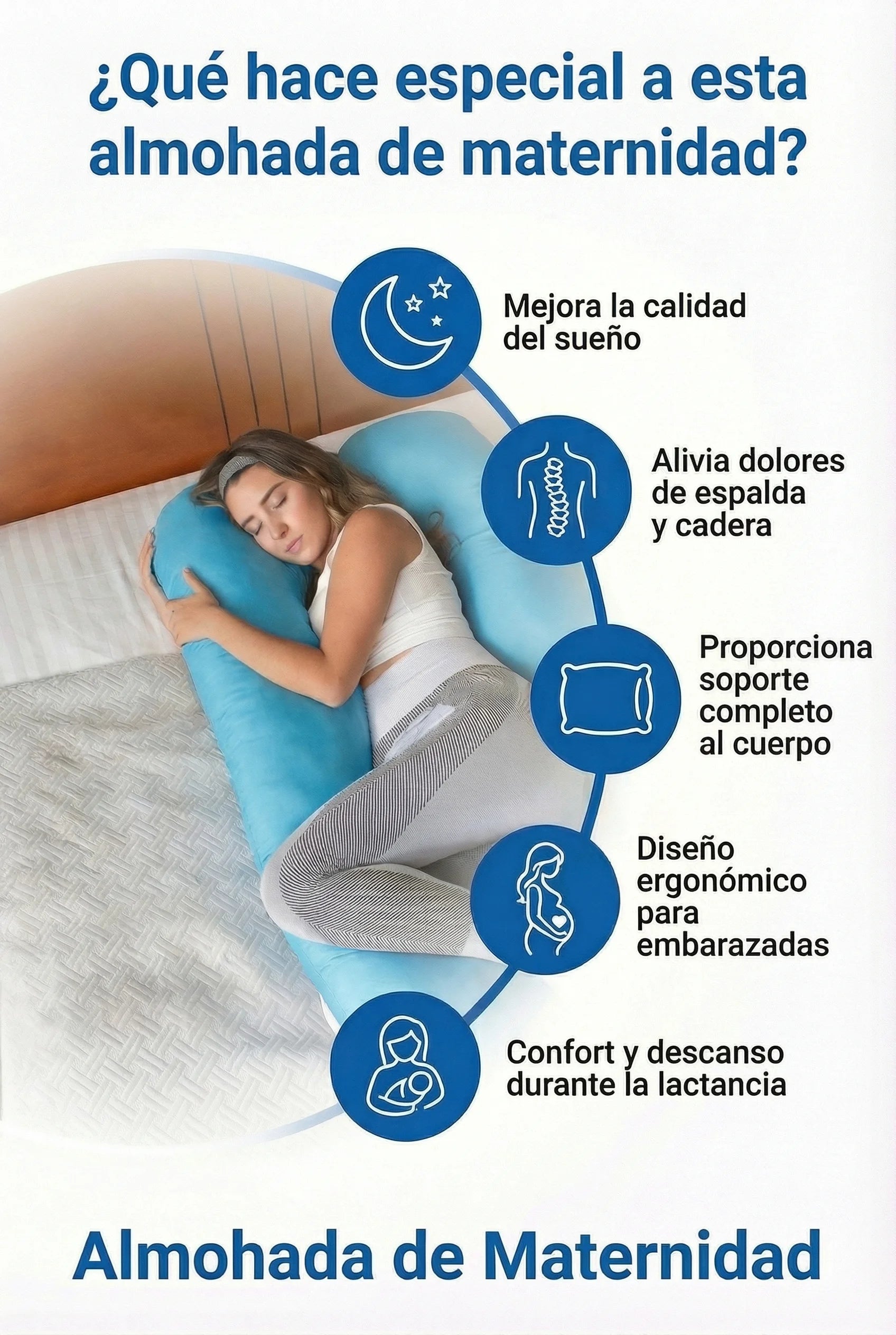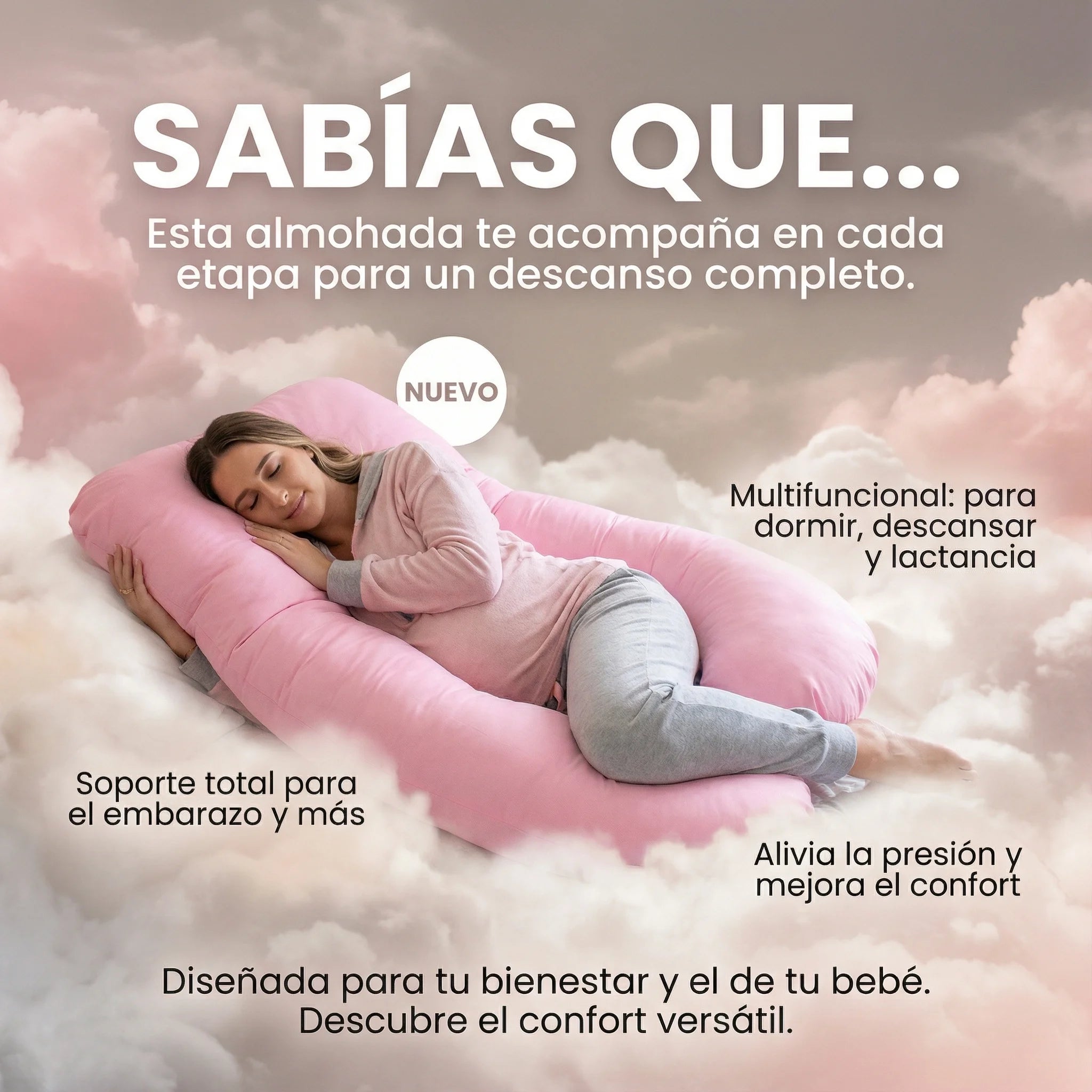 Esta almohada está diseñada para acompañarte durante el embarazo, el descanso diario y la lactancia. Su formato envolvente permite adaptarla a diferentes posiciones según tus necesidades de cada etapa.